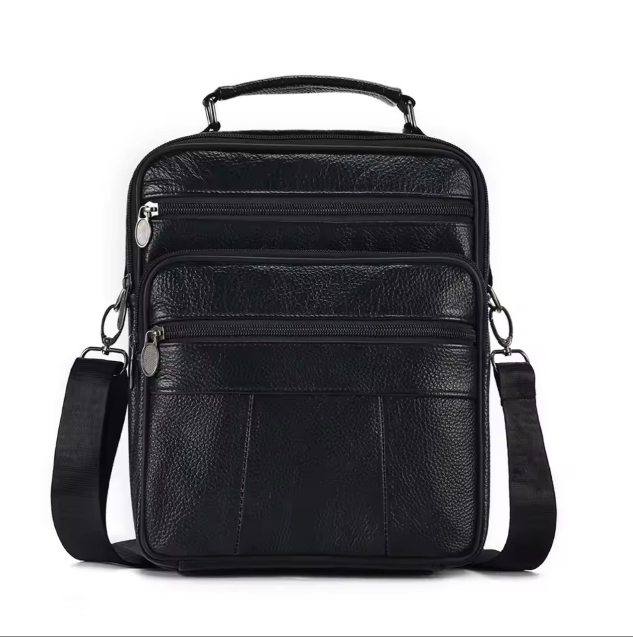 Чоловіча шкіряна сумка чорного кольору - стильний аксесуар, який підійде для повсякденного використання. Сумка має два основних відділення на блискавці. На фасаді є три відділення, а так само на тильній стороні дві кишені, всі вони закриваються блискавкою. Сумка виготовлена з натуральної шкіри середньої жорсткості. Носити сумку можна через плече, довжину можна відрегулювати самостійно за допомогою плечевого ременя, що знімається.