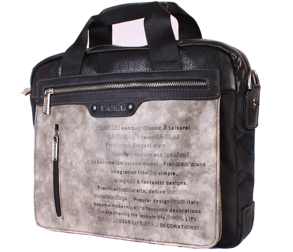 Раді представити сумку для ноутбука 13,6 дюймів з якісних матеріалів які комбіновані при виготовленні даного виробу, а саме міцного текстилю та натуральної шкіри, компактна і зносостійка. В основному відділенні влаштований спеціальний кишеню з м'якою підкладкою для ноутубка і дві накладні кишені для гаманця і смартфона, а підкладка виконана з фірмової тканини Haokai, додатково дві кишені на передній зовнішній стороні і кишеню на магнітній кнопці на тильній стороні, також в комплекті є знімний ремінь на плече.